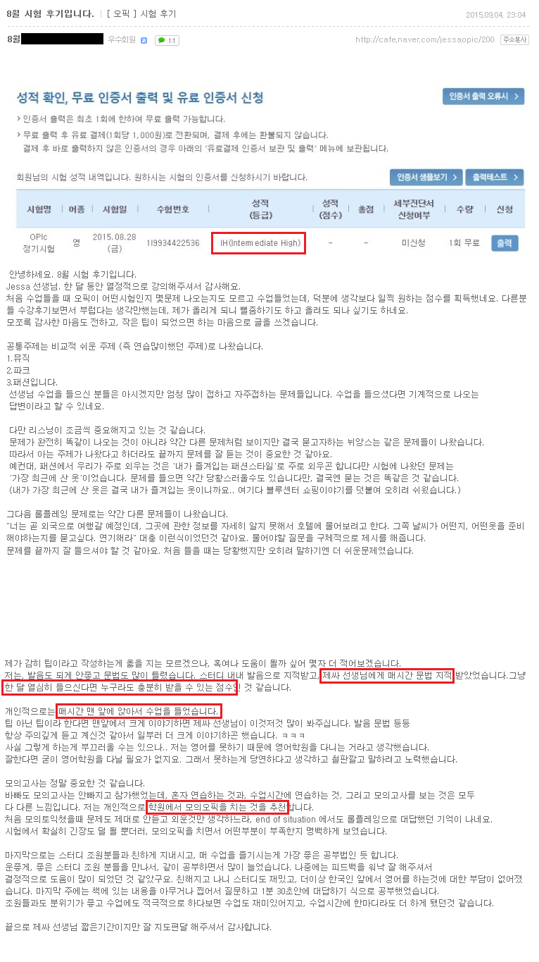 오픽 | (대구오픽 IH후기) 한달 열심히 듣는다면 누구라도 충분히 받을수 있는 점수!! 페이지 정보 작성자 MELPARK 작성일15-09-18 09:10 조회4,138회 댓글0건 이전글 다음글 목록 본문 (클릭 하시면 크게 보실 수 있습니다.) 수강생 후기 입니다. 더 많은 후기는 우측 카페 링크 가입 후 보실 수 있습니다. 이전글 다음글 목록