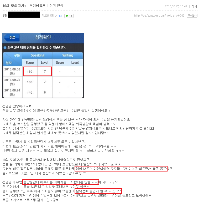 토스 | (대구토스 7급후기) 10회 모의고사반 후기예요♥ 페이지 정보 작성자 MELPARK 작성일15-09-18 09:11 조회4,136회 댓글0건 이전글 다음글 목록 본문 (클릭 하시면 크게 보실 수 있습니다.) 수강생 후기 입니다. 더 많은 후기는 우측 카페 링크 가입 후 보실 수 있습니다. 이전글 다음글 목록
