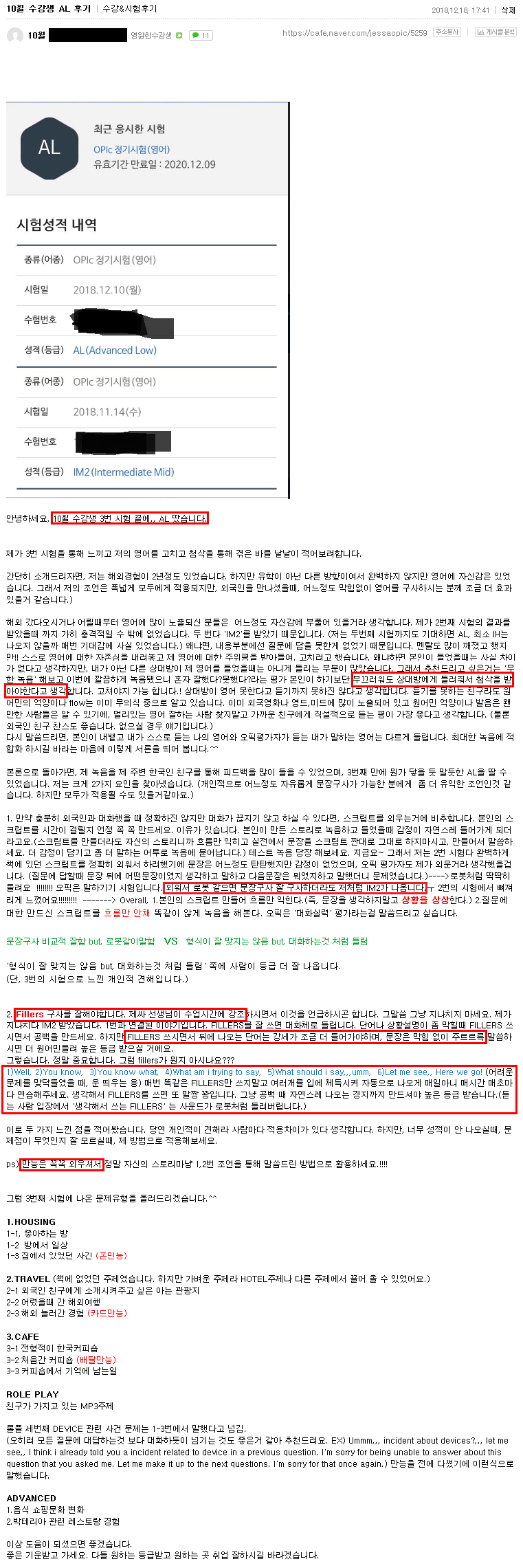 해외 갔다오시거나 어릴때부터 영어에 많이 노출되신 분들은 어느정도 자신감에 부풀어 있을거라 생각합니다. 제가 2번째 시험의 결과를 받았을때 까지 가히 충격적일 수 밖에 없었습니다. 두 번다 'IM2'를 받았기 때문입니다. (저는 두번째 시험까지도 기대하면 AL, 최소 IH는 나오지 않을까 매번 기대감에 사실 있었습니다.) 왜냐면, 내용부분에선 질문에 답을 못한게 없었기 때문입니다. 멘탈도 많이 깨졌고 했지만!! 스스로 영어에 대한 자존심을 내려놓고 제 영어에 대한 주위평을 받아들여, 고치려고 했습니다. 왜냐하면 본인이 들었을때는 사실 차이가 없다고 생각하지만, 내가 아닌 다른 상대방이 제 영어를 들었을때는 아니게 들리는 부분이 많았습니다. 그래서 추천드리고 싶은거는 '무한 녹음' 해보고 이번에 깔끔하게 녹음됐으니 혼자 잘했다?못했다?라는 평가 본인이 하기보단 부끄러워도 상대방에게 들려줘서 첨삭을 받아야한다고 생각합니다. 고쳐야지 가능 합니다.! 상대방이 영어 못한다고 듣기까지 못하진 않다고 생각합니다. 듣기를 못하는 친구라도 원어민의 억양이나 flow는 이미 무의식 중으로 알고 있습니다. 이미 외국영화나 영드,미드에 많이 노출되어 있고 원어민 억양이나 발음은 왠만한 사람들은 알 수 있기에, 멀리있는 영어 잘하는 사람 찾지말고 가까운 친구에게 직설적으로 듣는 평이 가장 좋다고 생각합니다. (물론 외국인 친구 찬스도 좋습니다. 없으실 경우 얘기입니다.)