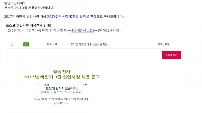 인적성을 볼 수 있는 기회를 줬던 회사는 LG, 삼성, 포스코, SK였고, 인적성 통과는 LG, 삼성, 포스코였습니다.