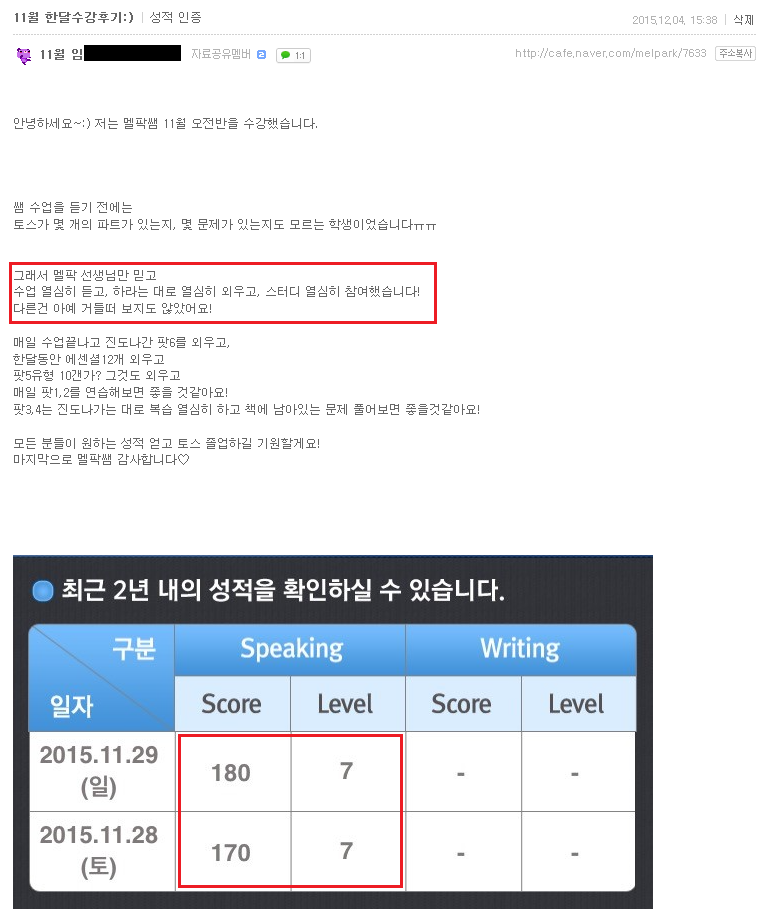 토스 | (대구토스 7급후기)선생님만 믿고 하라는대로 했더니^^ 한달 180점 7급 획득!! 페이지 정보 작성자 MELPARK 작성일15-12-07 17:04 조회4,367회 댓글0건 이전글 다음글 목록 본문 (클릭 하시면 크게 보실 수 있습니다.) 수강생 후기 입니다. 더 많은 후기는 우측 카페 링크 가입 후 보실 수 있습니다. 이전글 다음글 목록