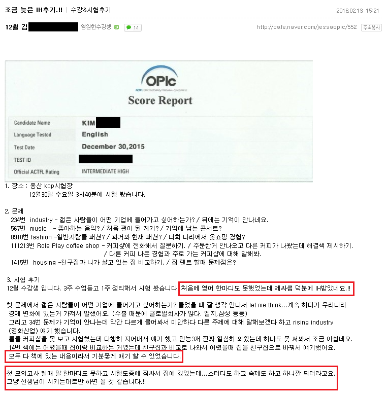오픽 | (대구오픽 IH후기) 처음에 영어 하나도 못했는데..선생님 덕분에 IH 획득!! 페이지 정보 작성자 MELPARK 작성일16-02-17 11:22 조회4,056회 댓글0건 이전글 다음글 목록 본문 (클릭 하시면 크게 보실 수 있습니다.) 수강생 후기 입니다. 더 많은 후기는 우측 카페 링크 가입 후 보실 수 있습니다. 이전글 다음글 목록